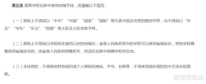 官方在公示中使用的是中国民航飞行大学(暂名),为什么使用备注暂名呢?根据《高等学校命名暂行办法》的规定,“原则上不得冠以“中华”“中国”“国家”“国际”等代表中国及世界的惯用字样”。所以,“中国民航飞行大学”这个校名能否得到教育部的批准还不好说。当然,政策也是有弹性空间的,比如“原则上”,就看能不能打破原则了。同时,在《高等学校命名暂行办法》的第十四条又规定,“对于服务国家和区域重大战略等特殊情况的高等学校命名事项,由国务院教育行政部门审批。”