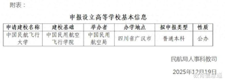 12月19日,中国民用航空局发布《关于高等学校设置事项的公示》,拟按程序向教育部申报设立中国民航飞行大学(暂名)。