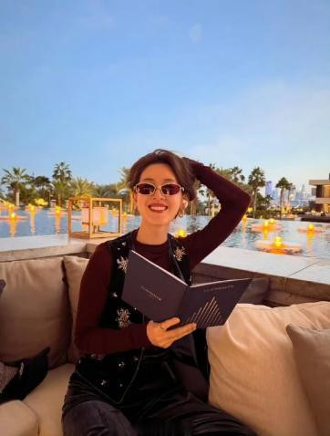 照片里的她身处异国休闲场景中,酒红色修身内搭再搭配黑色丝绒背心与阔腿裤,精致又不失随性。