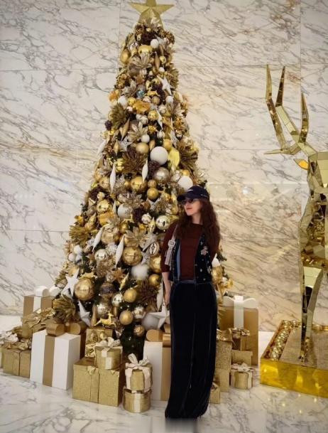 另一张照片显示,她站在装饰华丽的金色圣诞树旁,头戴帽子,整体状态十分松弛。