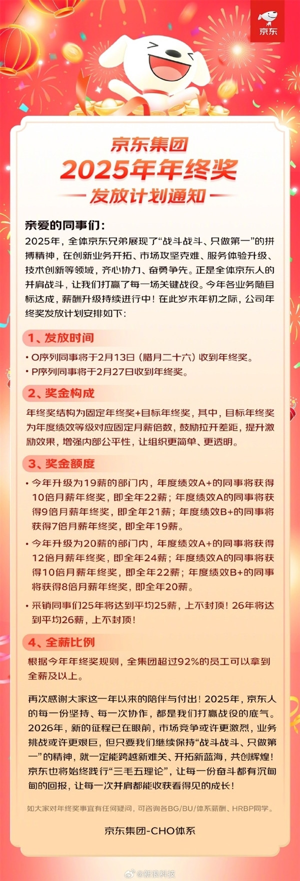 此外,京东还发布了2025年年终奖发放计划,全集团92%的员工拿满甚至拿到超额年终奖,年终奖总投入同比增幅超过70%。